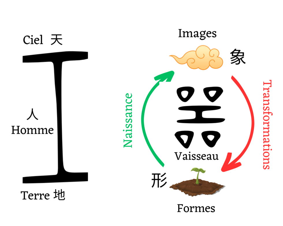 Die Schale ist also die physische Form, die Repräsentationen empfängt. Die dritte Wesenheit, der Mensch, ist das Gefäß des Austauschs zwischen dem Himmel-Erde-Paar, der körperlichen Form (xíng 形) und den immateriellen Bildern (xiàng 象). Dies ist das Gefäß (ki 器), in dem ihre Transformationen stattfinden. Unser berühmtes Schlüsselelement des Quadrats finden Sie in der alten Schreibweise des Gefäßes ki (器).
