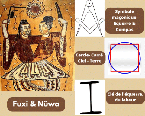 In den chinesischen Gründungsmythen finden wir Fuxi und Nüwa, das ursprüngliche Paar, umschlungen wie der Caduceus des Merkur, wobei der eine das Winkelmaß und die andere den Zirkel hält, die das Quadrat und den Kreis darstellen, Symbole der Wissens von Himmel und Erde. Bei diesem Paar ist das Winkelmaß das Symbol des Mannes: Fuxi, dem die Tradition auch das Bagua und die 64 Hexagramme zuschreibt. Diese 64 Hexagramme repräsentieren die 64 Stufen der Transformation vom Himmel (Qian) zur Erde (Kun), von Yang zu Yin. Aus diesem Grund hält Fuxi den Winkel, das das Wissen symbolisiert, das Himmel und Erde verbindet.