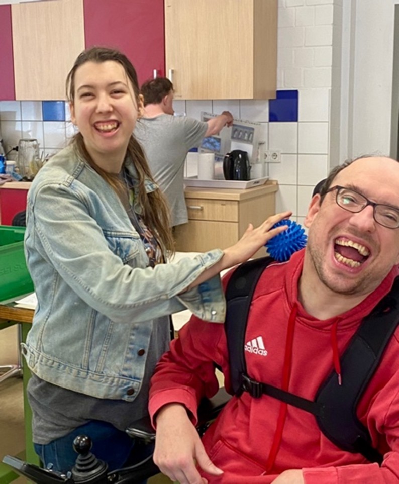 Yvonne aus einer Gruppe ist jetzt meine „Assistentin“ und gibt anderen Gruppenmitgliedern oder ihren Betreuer:innen kleine Behandlungen, wenn ich nicht da bin. Das macht nicht nur ihr große Freude.
