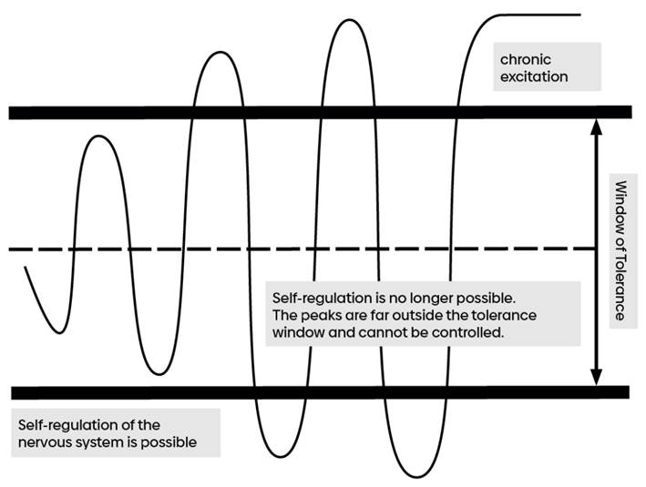 O sistema nervoso parassimpático representa o aspeto yin. É responsável por qualquer forma de acalmia. Tal como acontece com o yin e o yang, uma mudança dinâmica e rítmica entre estes dois aspetos é uma expressão de um equilíbrio saudável e essa mudança deve ocorrer dentro de um certo intervalo de tolerância. Para compreender este processo, podemos trabalhar com uma imagem: existe um teto. E um piso. Se as fases de ativação e relaxamento se moverem dentro destes limites, tudo está bem. Até que ponto esses limites são definidos é novamente uma questão individual, mas determina o quão resistentes ao stress e resilientes somos. Se a distância entre o teto e o chão for pequena, a amplitude pode rapidamente ultrapassar o teto ou atravessar o chão. Com uma grande distância, por outro lado, há amortecimento suficiente para absorver até mesmo grandes intensidades de stress. Essa janela de tolerância é moldada principalmente nos primeiros anos de vida, sobretudo pela relação com cuidadores próximos.