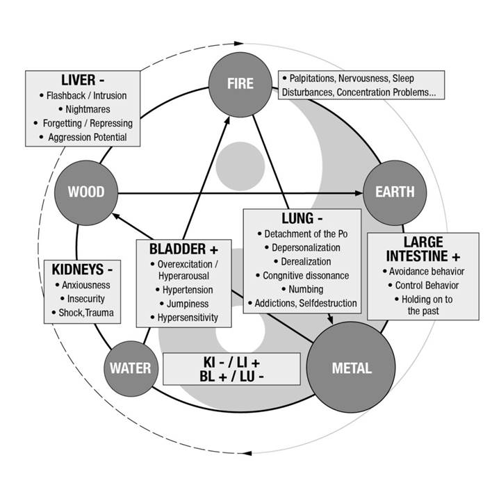 Para compreender o processo progressivo de traumatização e, especialmente, o transtorno de stress pós-traumático (TSPT), o sistema dos cinco elementos e a lei dos tempos de oposição ajudam-nos a obter insights valiosos. O elemento água, com os órgãos rim e bexiga, é filho do elemento metal, com os órgãos pulmão e intestino grosso. Se o elemento filho estiver fraco, o elemento mãe assume o controlo para protegê-lo. Além disso, os órgãos do elemento água estão intimamente relacionados com os órgãos do elemento metal através dos tempos de oposição. O rim está em tempo de oposição com o intestino grosso. A bexiga com os pulmões. A lei dos tempos de oposição afirma que a energia só pode estar num dos dois órgãos ligados pelo tempo de oposição correspondente. Se o rim estiver vazio, o intestino grosso está cheio. Se a bexiga estiver cheia, o pulmão está vazio. E no caso de uma experiência traumática, o meridiano da bexiga fica mais do que cheio, com inúmeros efeitos nos pulmões. Primeiro, há efeitos diretos na respiração. O Qi do pulmão fica enfraquecido. Em condições normais, ele proporciona uma respiração profunda e a descida do Qi. Agora, o Qi fica estagnado na cavidade torácica e tende a subir. A respiração fica superficial, curta. Desta forma, o corpo recebe menos energia. Pode desenvolver-se cansaço. Mas também formas de humor depressivo, na forma de tristeza, exaustão profunda e uma perceção de falta de sentido da própria existência. Os sinais comuns de uma deficiência de Qi pulmonar.